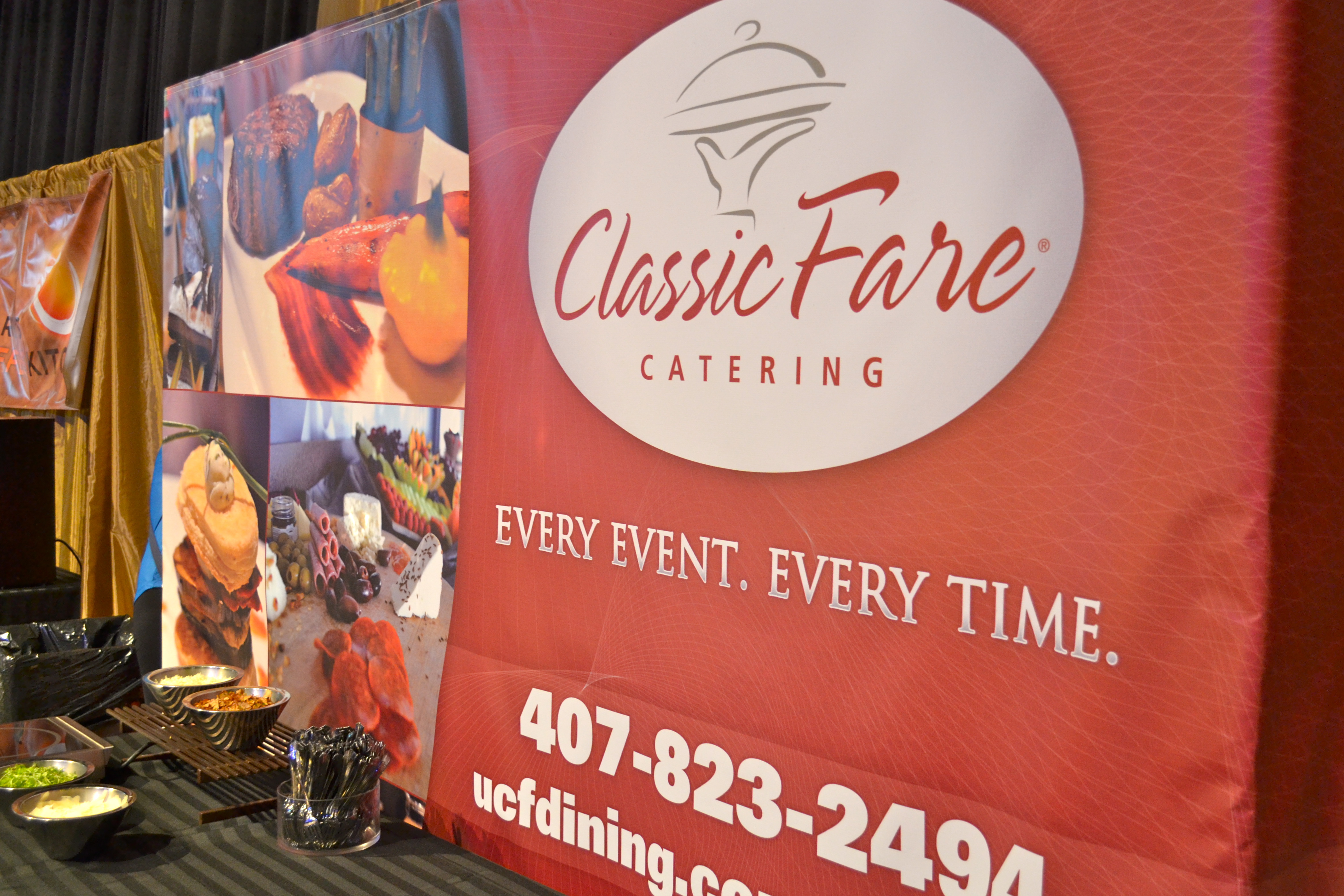 Backdrop for UCF's Catering Service during the UCF50 event held at the CFE Arena